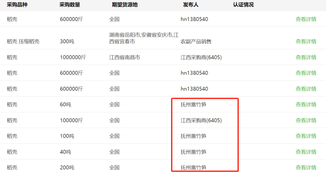如果想要提高收益,可以看看更好的需求方在哪?在惠农网上看,大量需求稻壳是抚州雷竹笋。