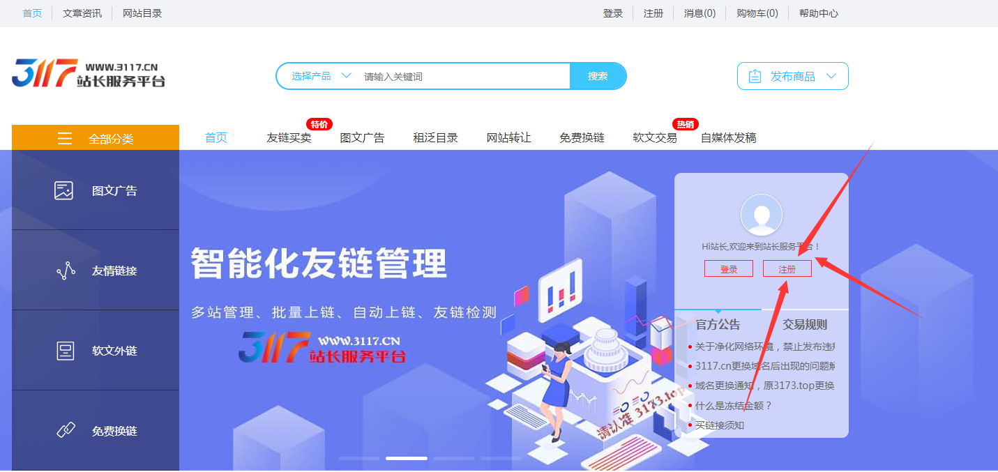 - 打开3117站长服务平台官方网站,找到注册入口,如下图。