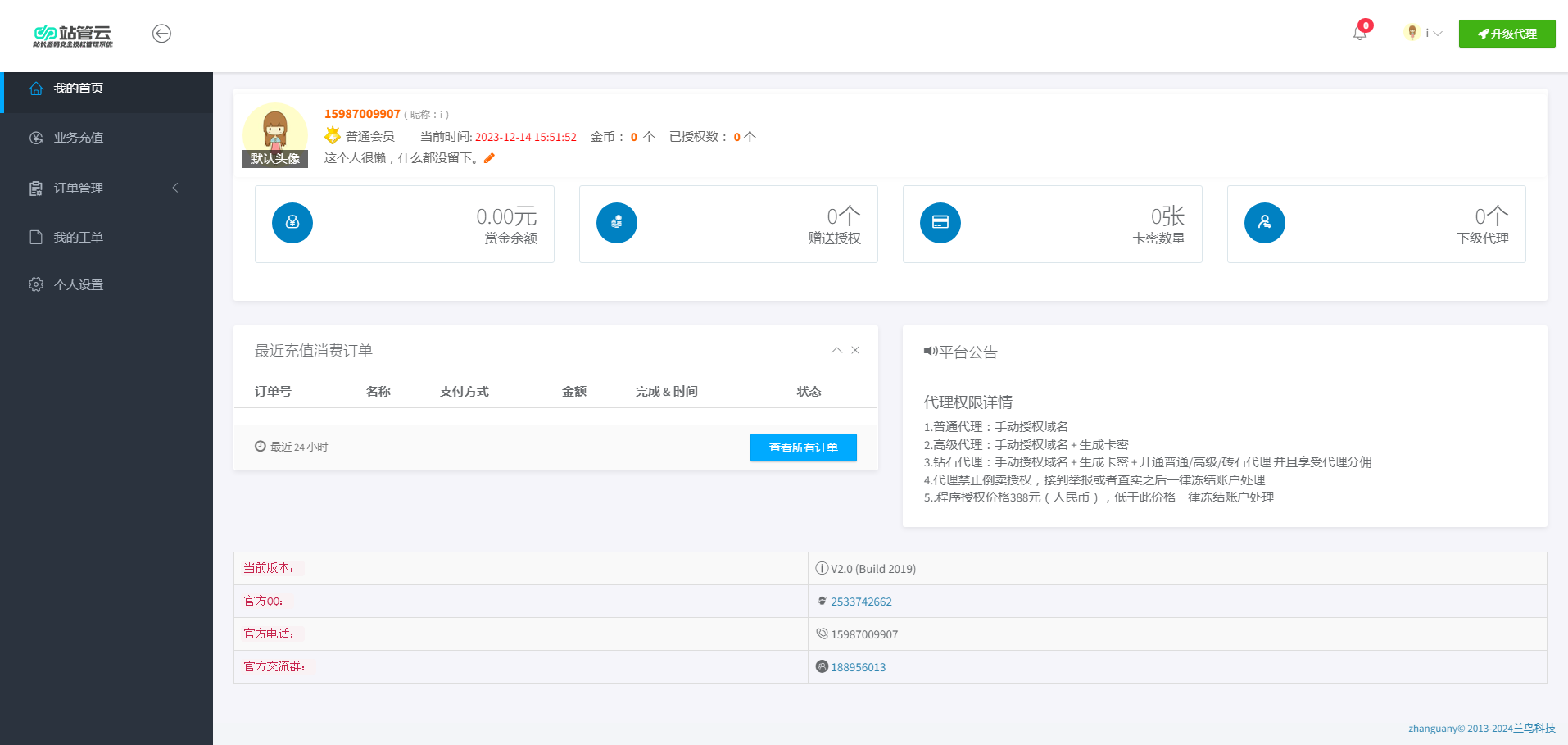 (3)高级代理【业务充值、充值记录、授权记录、消费记录、添加授权、授权列表、生成卡密、卡密列表、卡密使用记录、我的工单、个人设置】
