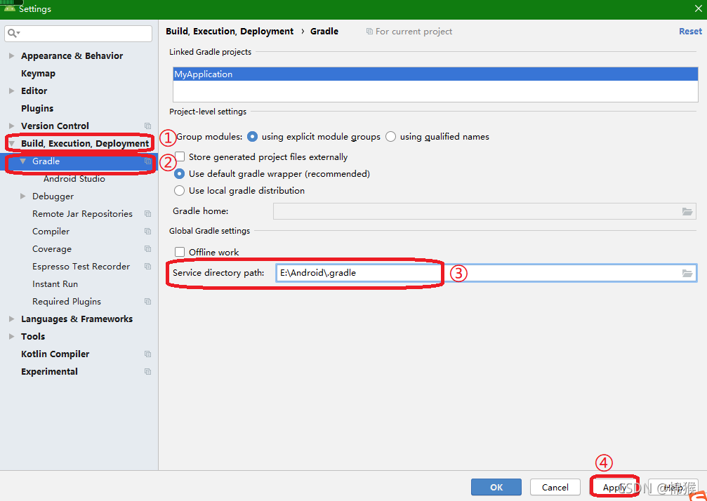 在Android Studio中,将gradle的路径修改为新路径。点击Android Studio的菜单栏“File->Settings”,之后在“Settings”对话框中,选择左侧的“Build,Execution,Deployment->Gradle”,最后在右侧的“service directory path”中选择移动后的新路径,如图3所示。